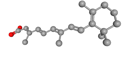 The molecule all-trans retinoic acid (ATRA) fits exactly into the nuclear receptor RAR, which it activates. The rotating image shows how and where exactly that retinoic acid molecule is located in the receptor. This position can be determined very accurately with molecular modeling in software. Note the two red oxygen atom balls in the animation! The retinoic acid (RA) is the activating ligand. Without this retinoic acid molecule there is no activation. And without vitamin A, there are no retinoic acid molecules. 37)